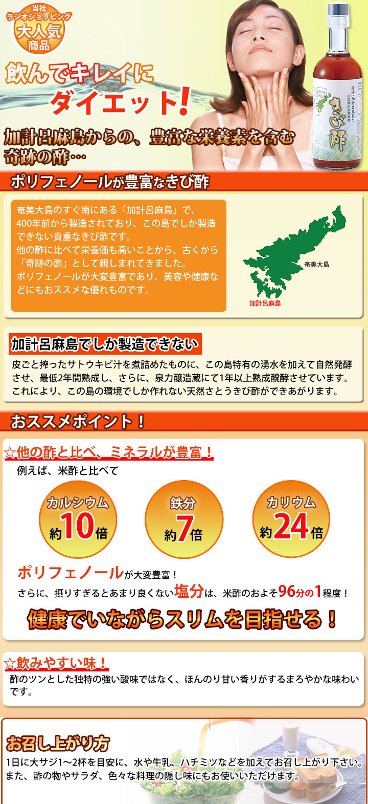 TV・ラジオ・新聞通販でおなじみ!【快適生活】の加計呂麻島のきび酢 3本セット 2011年01月23日 奄美大島の南端「加計呂麻島(かけろまじま)」でしか製造できない非常に貴重なきび酢で、あのカリスマモデルも絶賛の商品!お酢の中でも、この「きび酢」は、カルシウムが米酢の14倍以上、鉄分は10倍、カリウムは28倍。その栄養価の高さから、島では「奇跡の酢」として親しまれています。健康的にキレイにモデルラインを目指している方にオススメです。加計呂麻島のきび酢 3本セットTV・ラジオ・新聞通販でおなじみ!【快適生活】のオンライン通販サイト "TV・ラジオ・新聞通販でおなじみ!【快適生活】の加計呂麻島のきび酢 3本セット"へのコメントを書く お名前: ホームページアドレス: コメント: